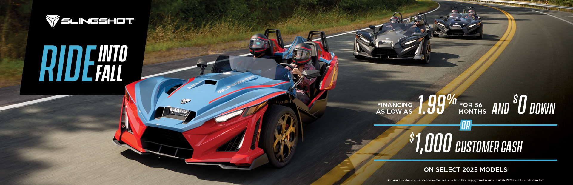 This is a limited time offer which is valid for the purchase of selected qualifying models and is subject to credit approval on qualified purchases financed during this program. Offer may not be combined with certain other offers, is subject to change and may be extended or terminated without further notice. Offer valid on new 2025 Slingshot® models (excluding S, S tech and Slingshot 10). Monthly payment and cost of borrowing will vary depending on amount borrowed and down payment/trade. Minimum amount to finance is $5,000. Example: $28,149 financed at 1.99% APR over 36 months = 36 monthly payments of $726; financed amount of $25,334 with $2,815 down payment, total cost of borrowing of $785 and a total obligation of $26,119. An example of monthly payments required on a 36-month term at 1.99% APR is $28.64 per $1,000 financed. Monthly payment examples do not include taxes, title, and other fees. Offer only valid to qualified customers, not all customers will qualify, other offers available, see dealer for details. Offer Valid: September 1 – 30, 2025.